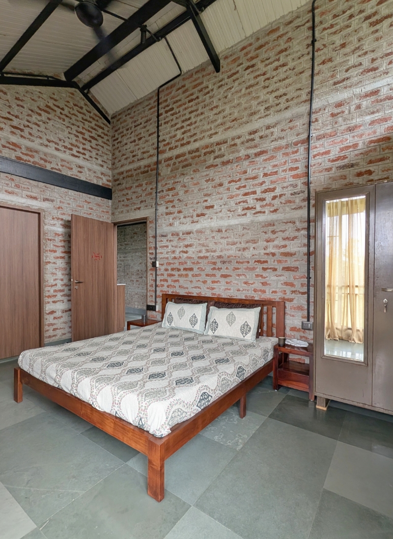 Reduced concrete use ensures low carbon impact. Power backup is provided for essentials, but guests are encouraged to use energy mindfully during rural power cuts.