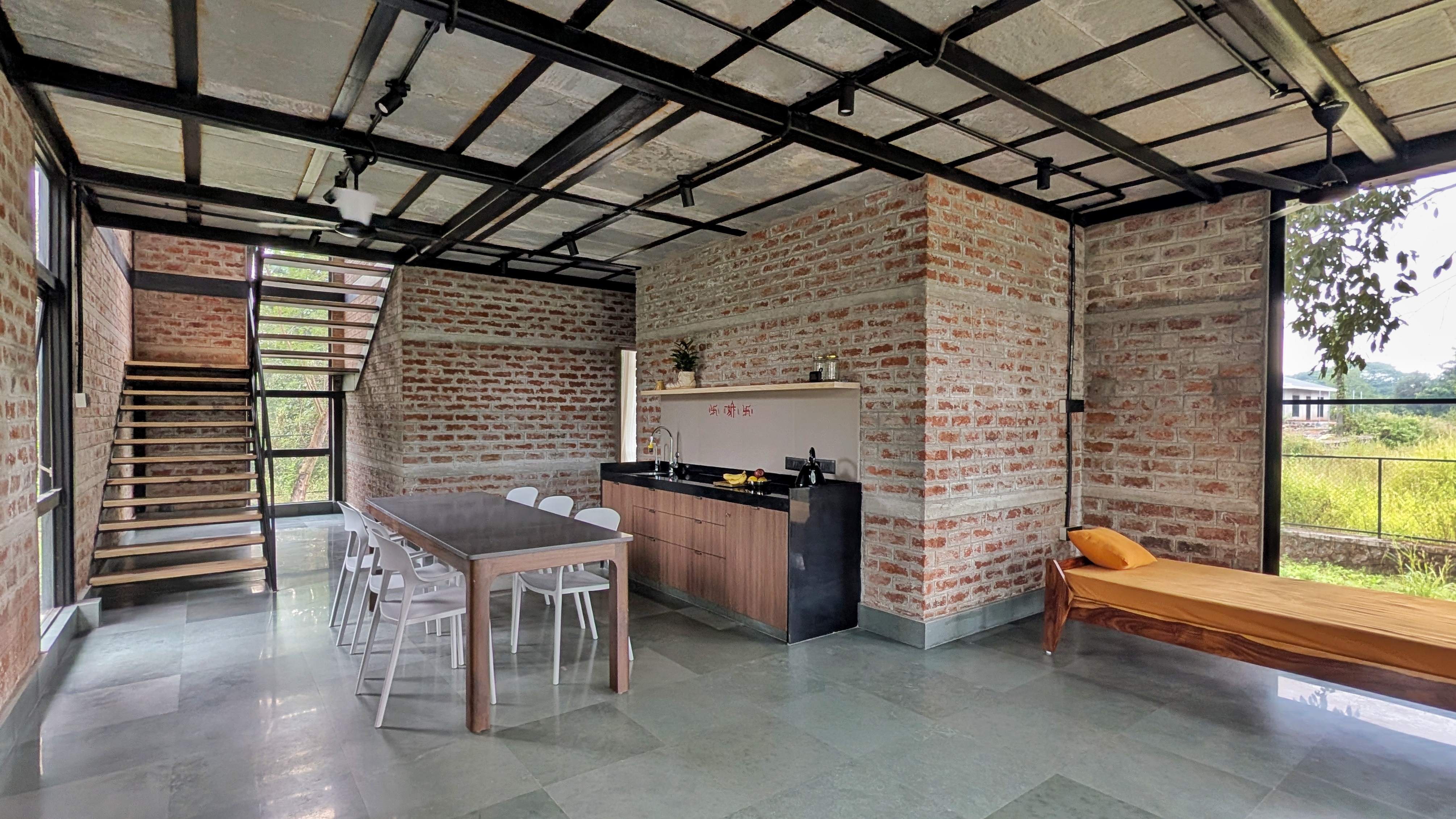 Designed as a low-impact, sustainable farmhouse, the structure blends into the forest rather than stand apart from it. The home is crafted using pre-engineered mild steel, Kota stone, and exposed brickwork, creating a raw yet refined dialogue with its surroundings.