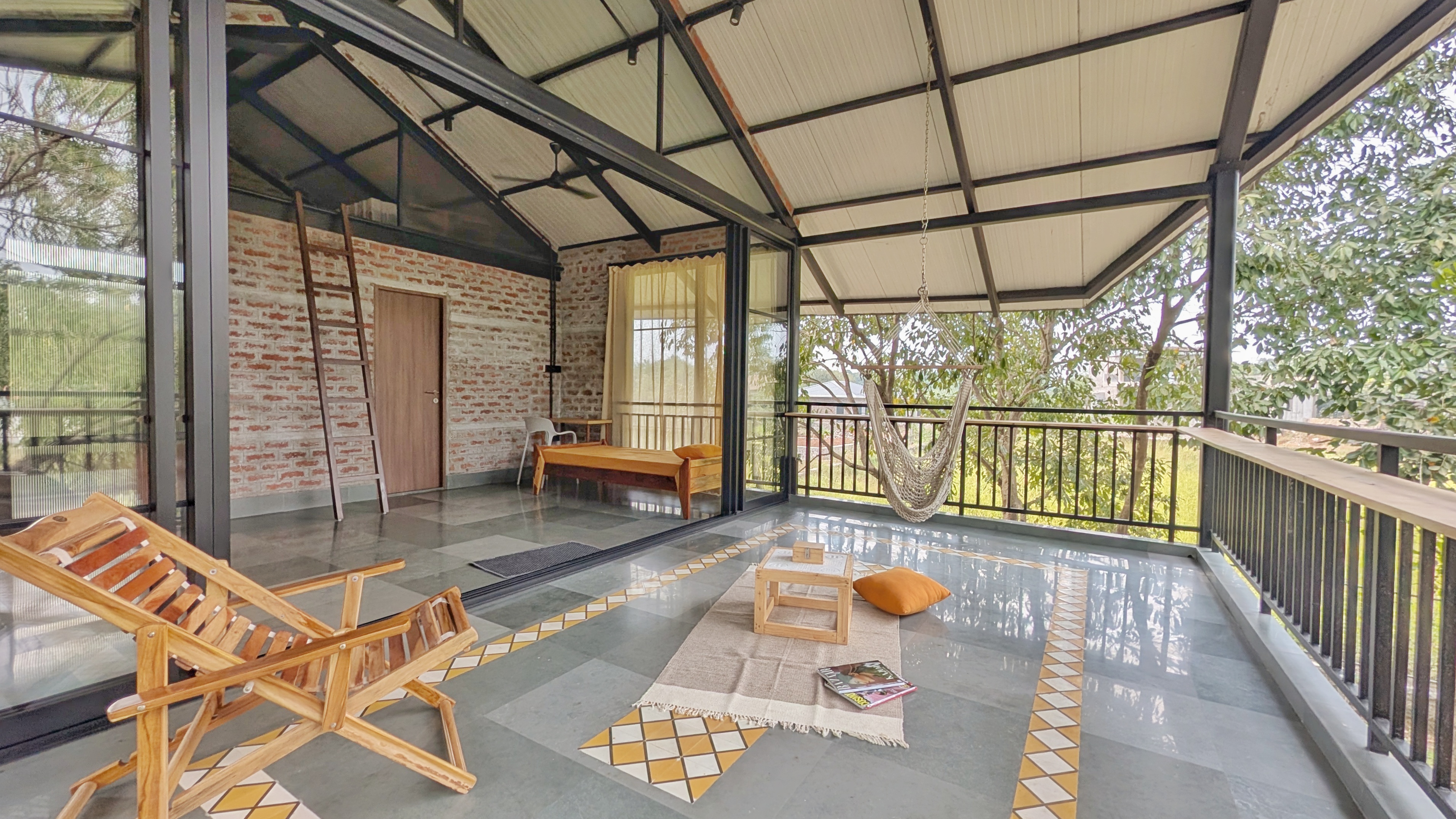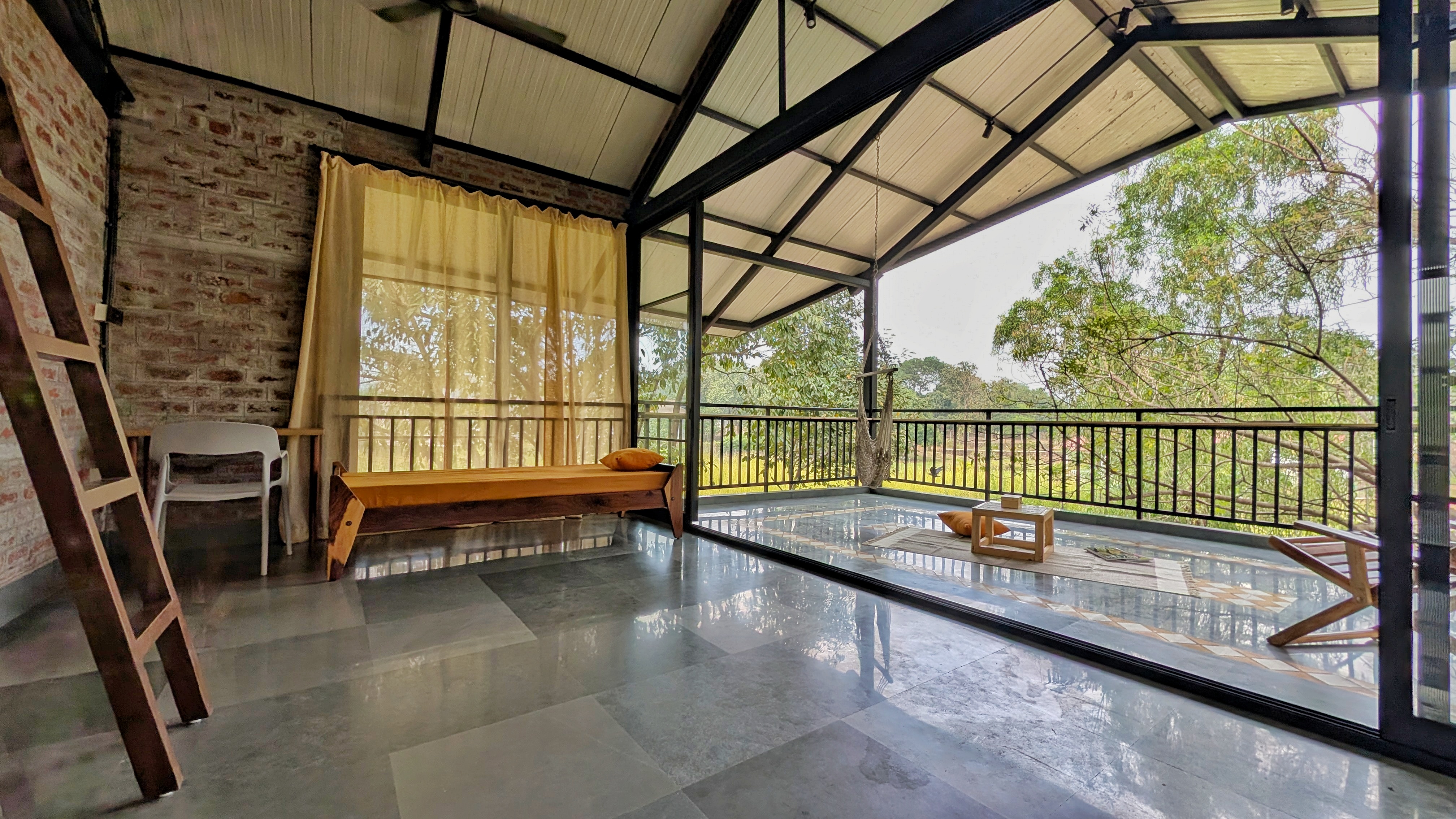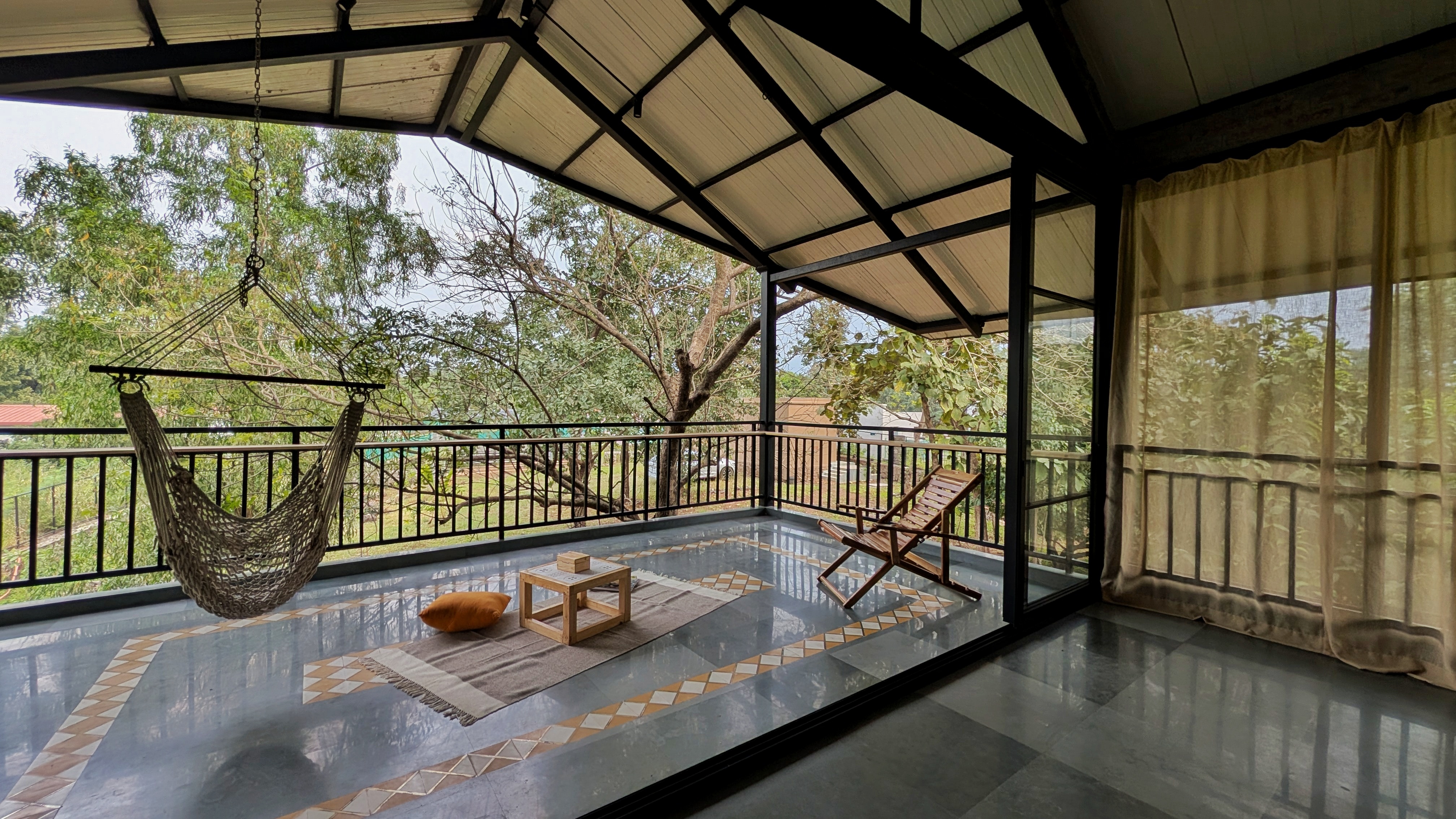 The verandah serves as a bridge between indoors and outdoors — perfect to sip chai, play board games, or unwind on the charpai.