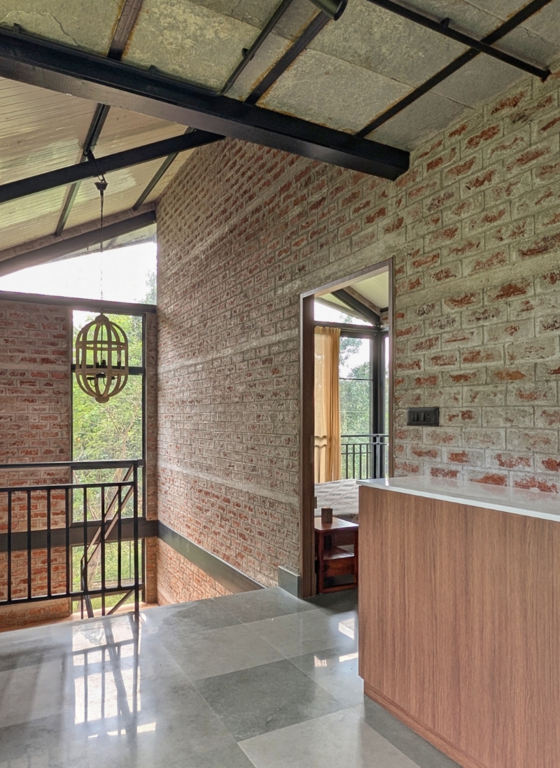 Designed as a low-impact, sustainable farmhouse, the structure blends into the forest rather than stand apart from it. The home is crafted using pre-engineered mild steel, Kota stone, and exposed brickwork, creating a raw yet refined dialogue with its surroundings.
