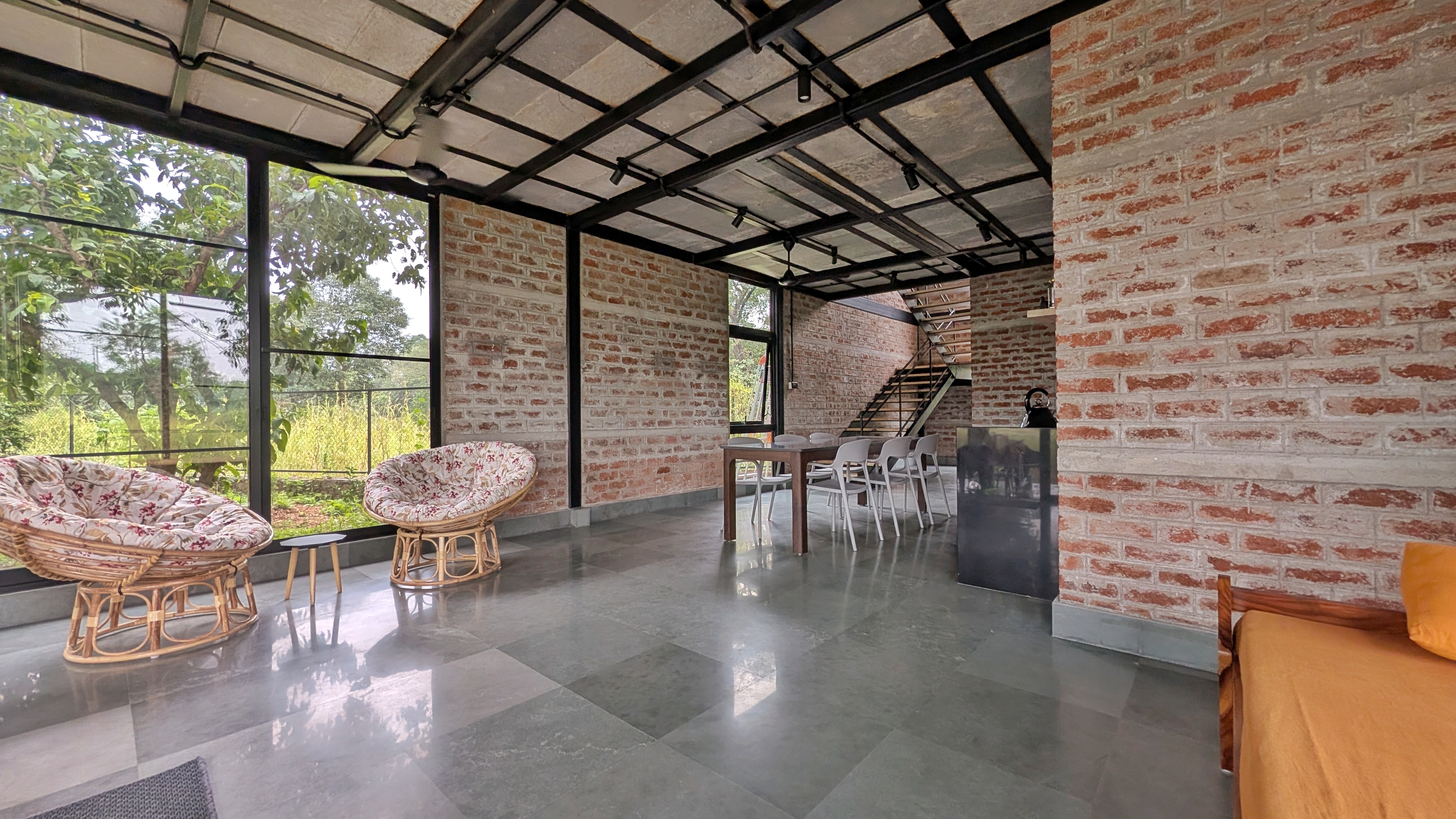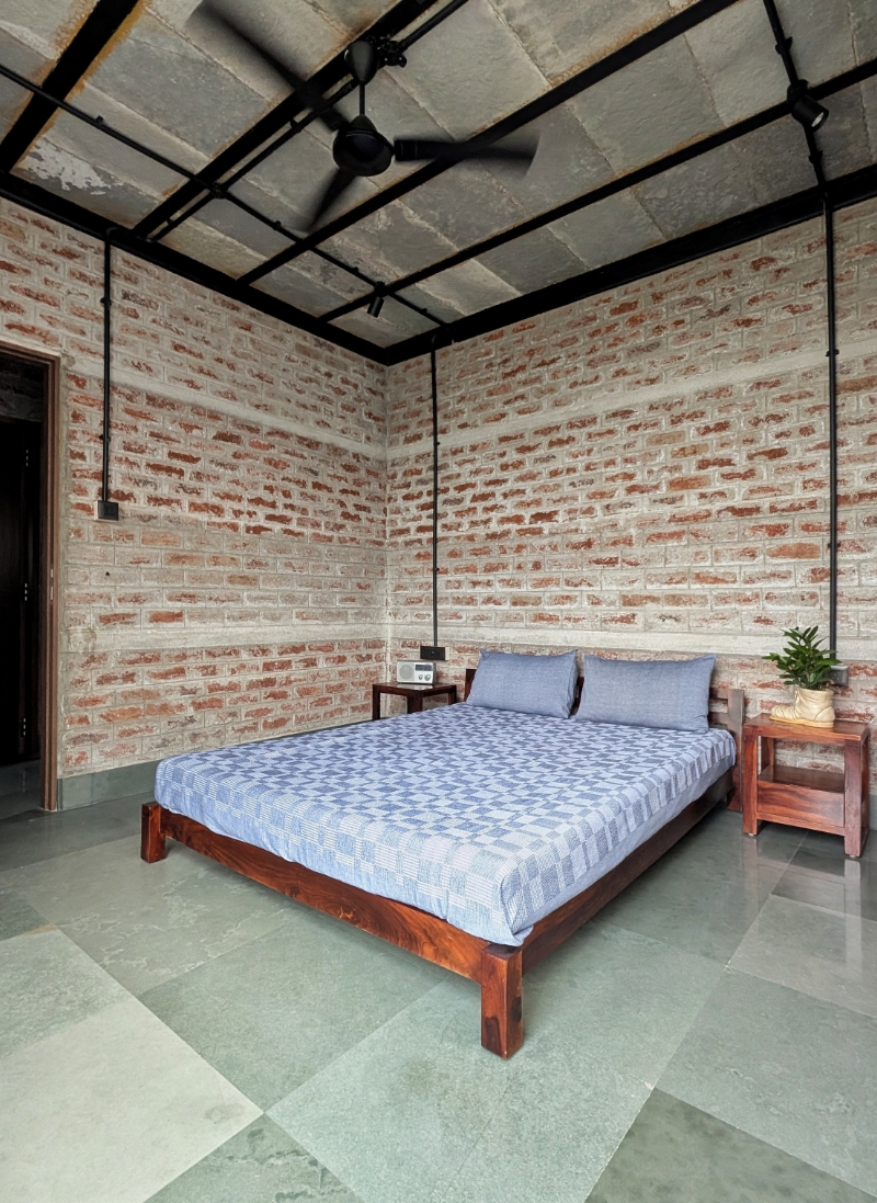 Unplastered brick walls and Kota stone floors maintain natural cooling.